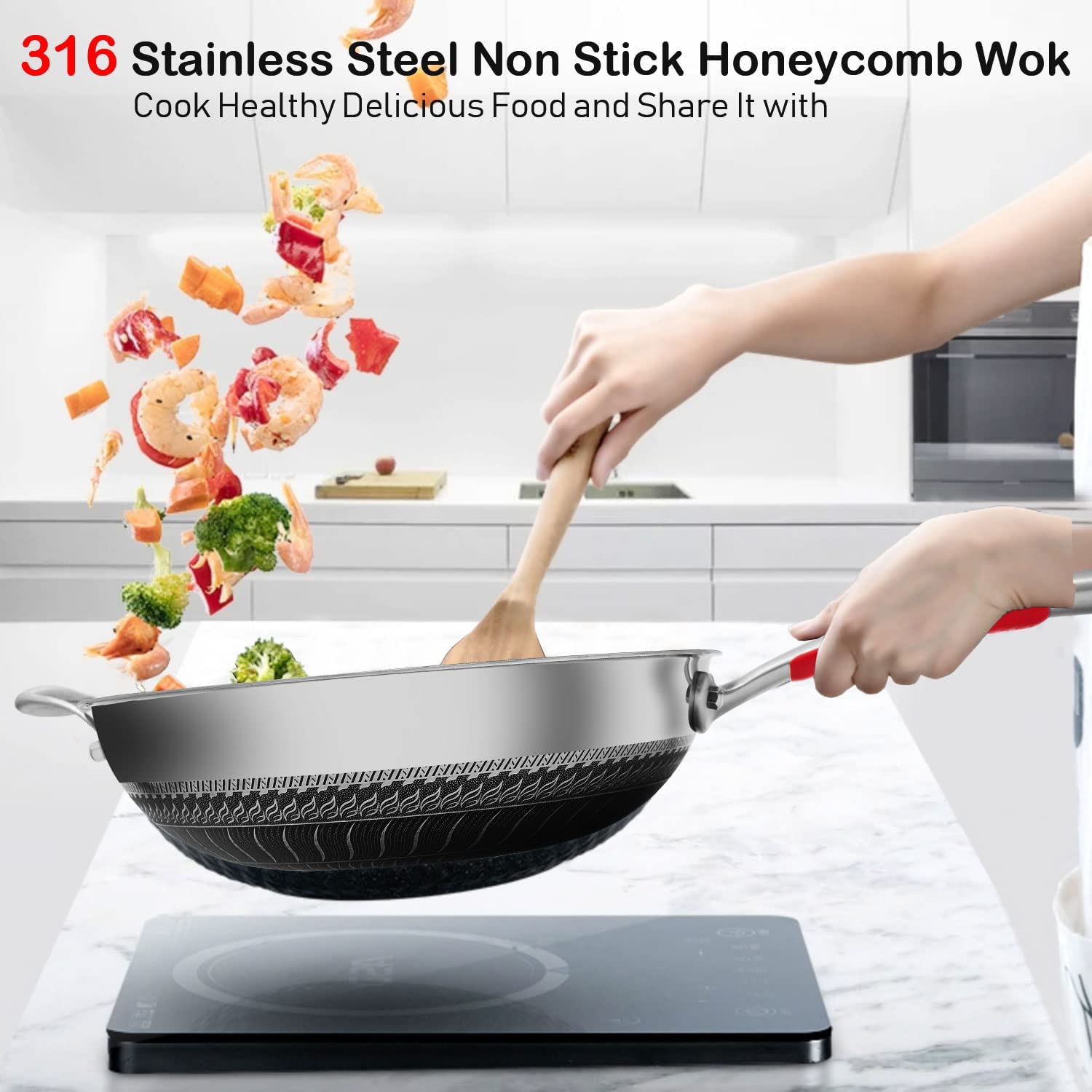 High quality material: made of SS316 - a medical grade stainless steel material with very good corrosion resistance and long service life. The interior non-stick layer is made of Honeycomb texture and high quality materials, which are non-toxic, resistant to wear and scratch. It has a better non-stick performance than the previous generation product. You can use shovels or steel balls to rub on it without damage. Aluminum alloy layer makes the wok to be heated evenly and quickly.