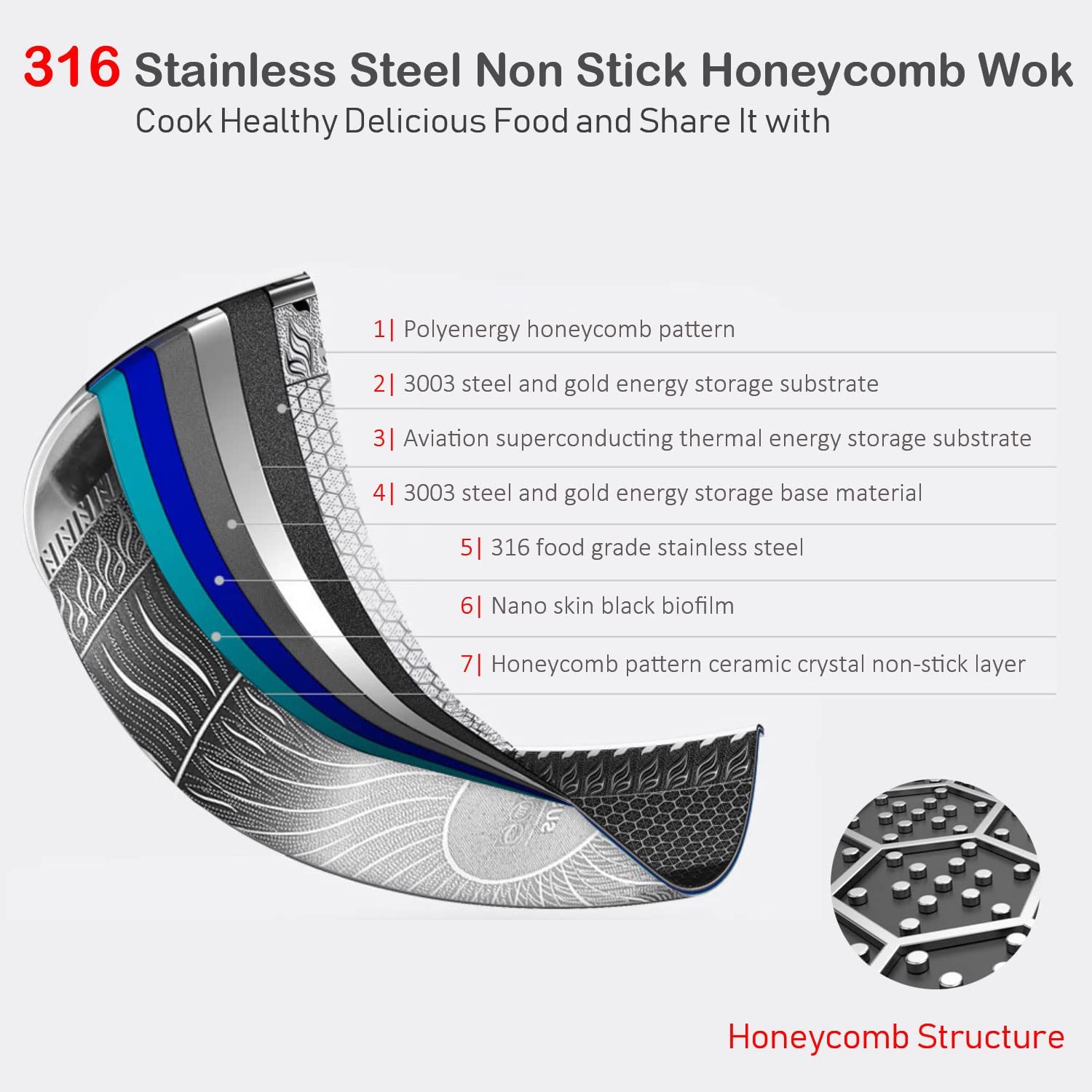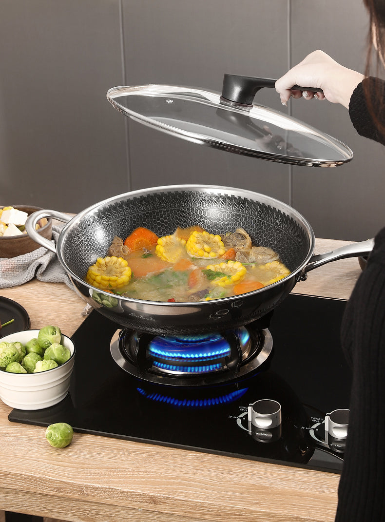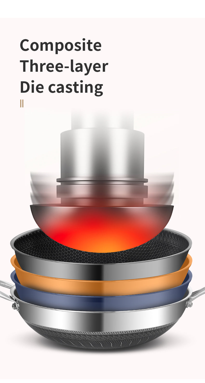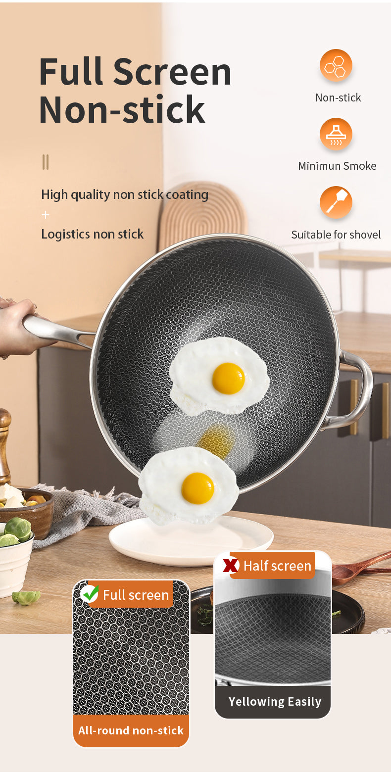 Material Composition: Newly Upgraded 316 Stainless Steel Wok Is Healthier, Multi-Layer Composite Special Process, Double-Sided Honeycomb Wok Pan, Fine Photo Etching Crystal Grain, High-Density Crystal Grain Improves Physical Non-Stick Performance.