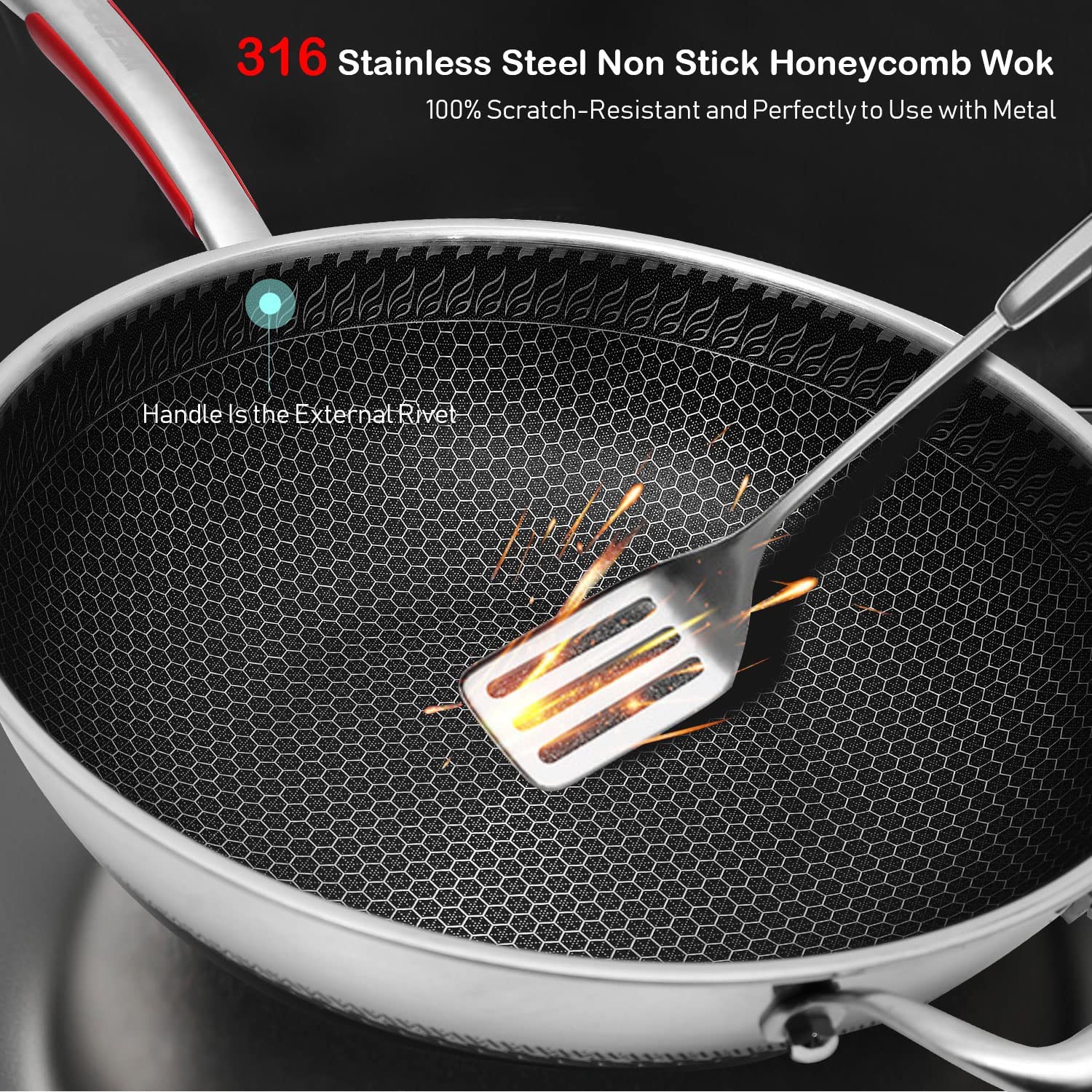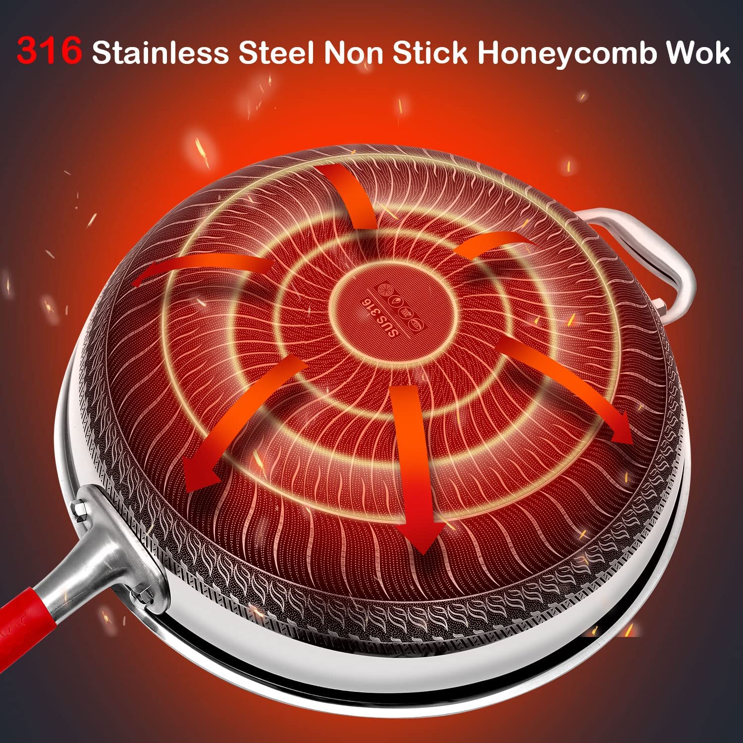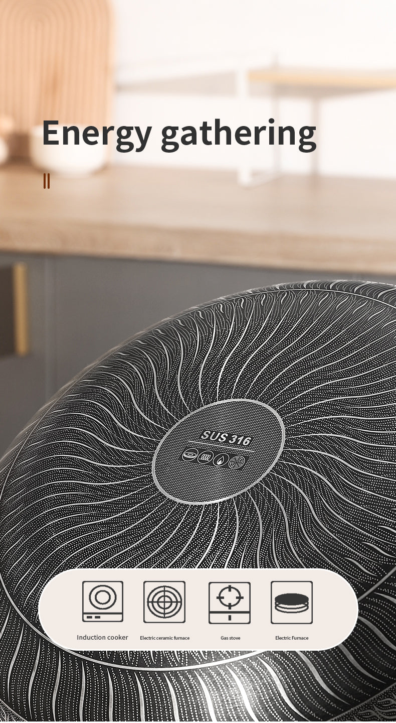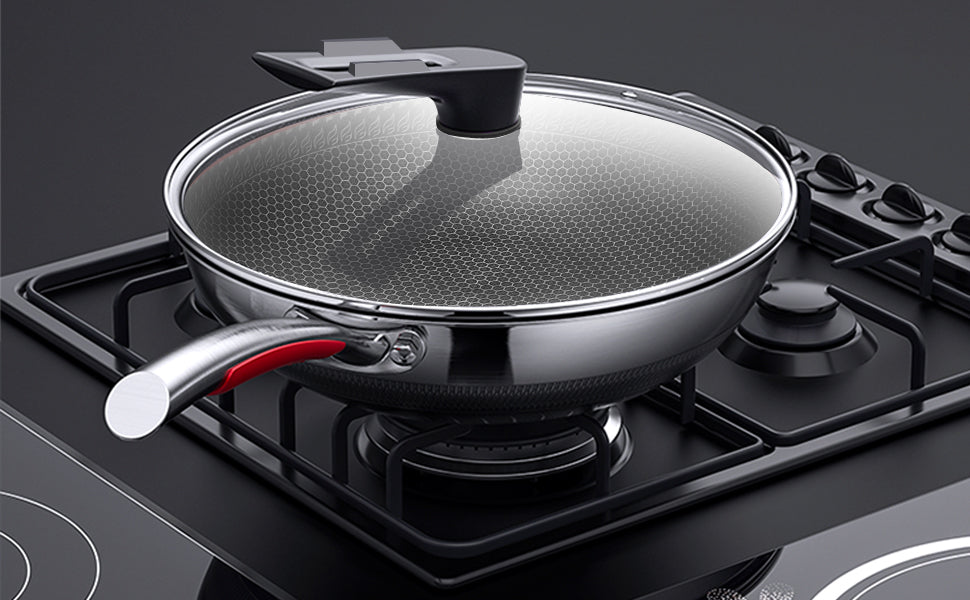 Material Composition: Newly Upgraded 316 Stainless Steel Wok Is Healthier, Multi-Layer Composite Special Process, Double-Sided Honeycomb Wok Pan, Fine Photo Etching Crystal Grain, High-Density Crystal Grain Improves Physical Non-Stick Performance.
